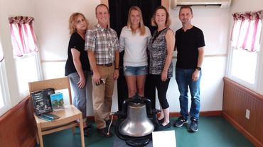 Two WYTC volunteers, Tim Aaron and Keith Frid, worked on restoring and burnishing the bell. Tim Aaron cleaned and burnished the bell, by using a paste of vinegar, flour, and salt and lots of elbow grease. Keith scrubbed the iron parts of the bell with a stiff wire brush and coarse steel wool, and rubbed oil over them, applied two coats of a satin finish black paint.